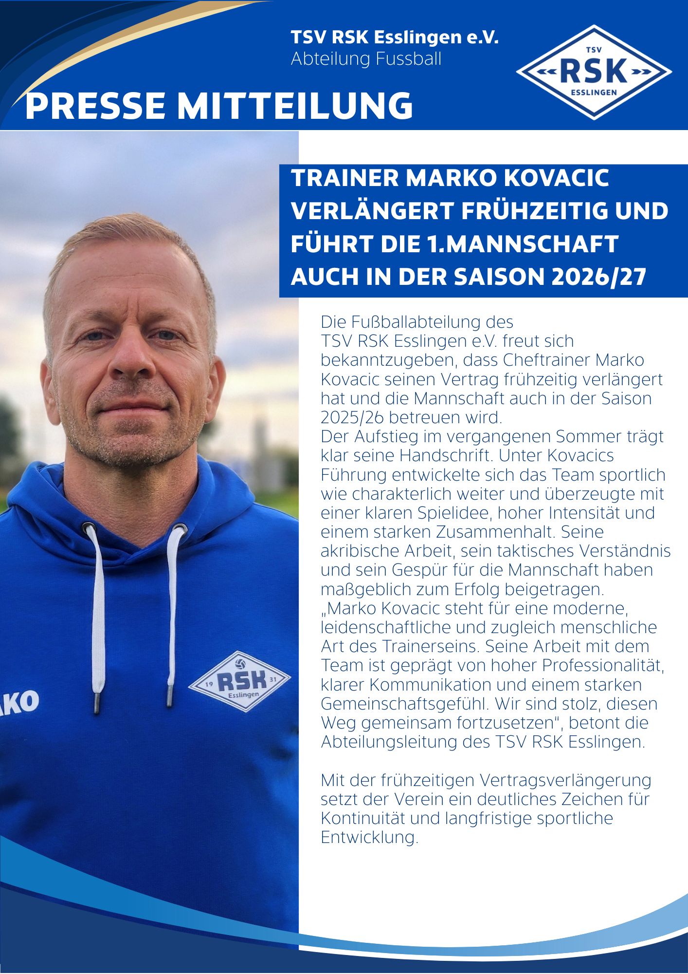 Marko Kovacic auch 2026/27 Trainer des TSV RSK