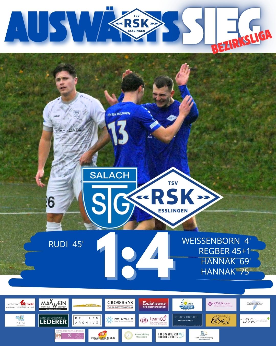 Die zweite Hälfte war erneut geprägt von viel Ballbesitz und Chancen die nicht konsequent genutzt wurden. Nach einer Notbremse musste Kapitän Traub den Platz verlassen und Salach witterte nun ihre Chance. Die Räume wurde nun größer und RSK nutzte diese konsequent. Der agile Hannak kam somit immer wieder frei vors Tor und schnürte einen Doppelpack. Am Ende steht ein verdienter Sieg für den RSK auf der Habenseite. Ein klasse Spiel unserer Jungs.
